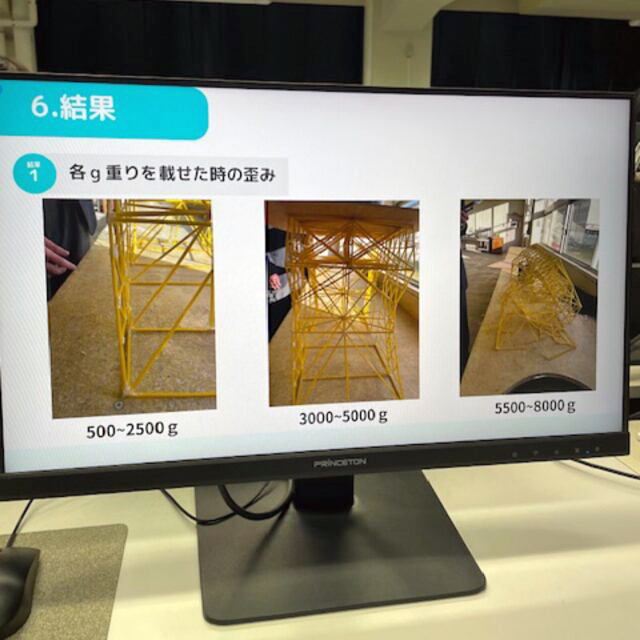 これは私たちが普段使用する橋が、どういった原理で荷重に耐えることが出来ているのか調べるために、「パスタ」を使って荷重試験を行っている画像です。