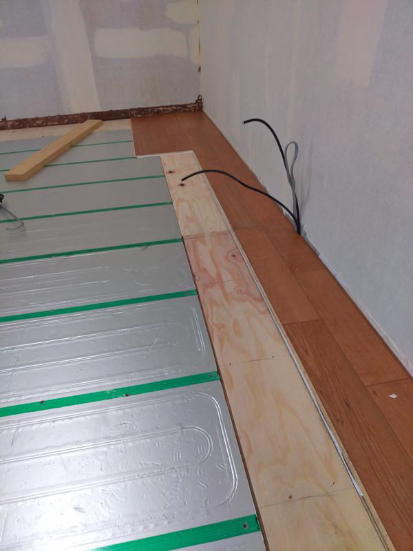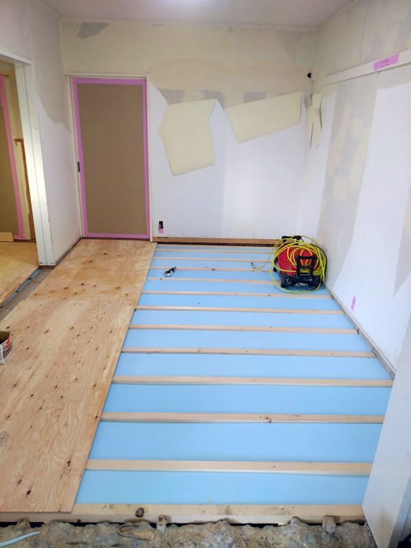 断熱材を敷き込み、下地を張り付けてから床暖房対応のフロア材を張り付けました。
